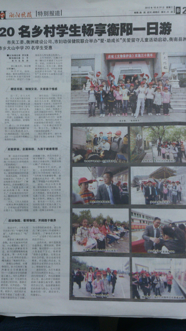 10月27日,由市關(guān)工委牽頭組織、我司承辦的關(guān)愛(ài)留守兒童愛(ài)心活動(dòng)在衡陽(yáng)市婦幼保健院舉行,活動(dòng)組織了來(lái)自衡南縣的20留守兒童代表參加,我司向這些留守兒童捐贈(zèng)了書(shū)包、字典等文具,中午安排他們?cè)诳系禄筒?,餐后帶領(lǐng)他們先后游覽了衡陽(yáng)市動(dòng)物園、衡陽(yáng)市博物館,最后到達(dá)我司承建的石鼓公安分局業(yè)務(wù)用房項(xiàng)目參觀。