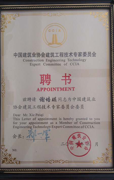2013年3月,中國(guó)建筑業(yè)協(xié)會(huì)會(huì)長(zhǎng)鄭一軍下發(fā)聘書(shū),茲聘請(qǐng)我公司謝培琪同志為中國(guó)建筑業(yè)協(xié)會(huì)建筑工程技術(shù)專家委員會(huì)委員。