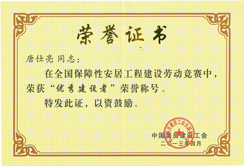 2013年4月,唐仕亮同志在由中國海員建工會(huì)舉辦的全國保障性安居工程建設(shè)勞動(dòng)競(jìng)賽中榮獲“優(yōu)秀建設(shè)者”的稱號(hào)